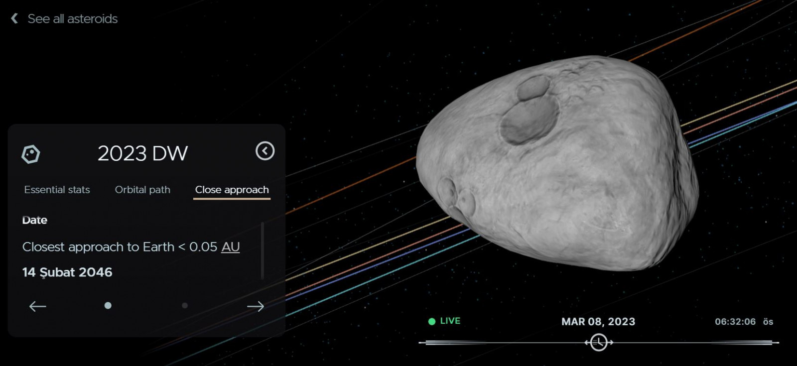 2023 DW ilk olarak Şubat sonunda Şili’de fark edildi ve Dünya’ya çarpma ihtimalinin 560’ta 1 olduğu tahmin ediliyor. NASA, “2046’da Dünya’ya çarpma olasılığı çok düşük olan 2023 DW adlı yeni bir asteroidi izliyoruz. Genellikle yeni nesneler ilk keşfedildiğinde, belirsizlikleri azaltmak ve yörüngelerini yıllar sonra yeterince tahmin etmek için birkaç hafta veri toplanmasını gerektirir. Yörünge analistleri, asteroit 2023 DW’yi izlemeye ve daha fazla veri geldikçe tahminleri güncellemeye devam edecek” diyor.