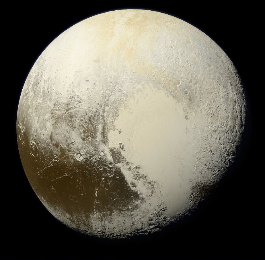 NASA Cumartesi günü, New Horizons uzay aracı tarafından çekilen ve Plüton’un gerçek renklerini gösteren çarpıcı bir görüntüyü Instagram’da paylaştı. Plüton’dan 22.025 mil (35,445 km) uzaklıkta çekilen fotoğraf aynı zamanda onun ‘kalbini’ – nitrojen ve metandan oluşan devasa bir buzulu- gösteriyor. Plüton’un yüzeyi su, metan ve nitrojenden oluşan buzla kaplı ve kayalık bir çekirdeğe ve muhtemelen derin bir okyanusa sahip olduğuna inanılıyor. NASA, Plüton’un yüzeyini çatlak ve kraterli, renkli beyaz, ten rengi ve kahverengimsi-kırmızı olarak açıkladı. Beyaz ve ten rengi, kahverengi-kırmızı yüzeyle buluşmak için fotoğrafın üst kısmında alçalırken, kısmen görünen “kalp” beyaz renkte görülebiliyor.