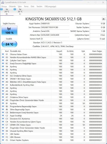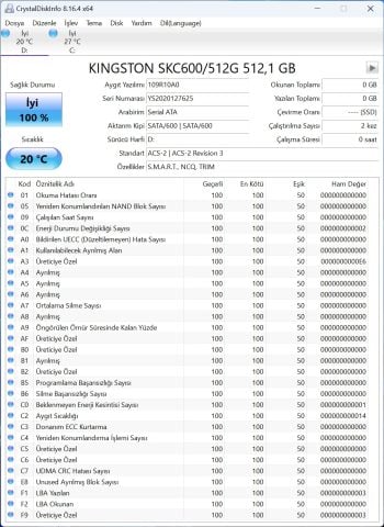 Kingston KC600 gerçek SSD’yi sistemimize taktık ve CrystalDiskInfo programını çalıştırarak SSD’nin özelliklerine baktık her şey olması gerektiği gibiydi.